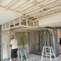 前回のつづき。 天井と壁の軽量鉄骨下地を終え 石膏ボードを張っています 石膏ボードの厚みや仕様も確認 写真手前、クロス紙が残った部分が元々の天井高さでして 元々の天井と高さが揃うように 新たに天井下地を組みました キッチン部分の下がり壁・袖壁と同じラインにカウンターの立ち上がり…