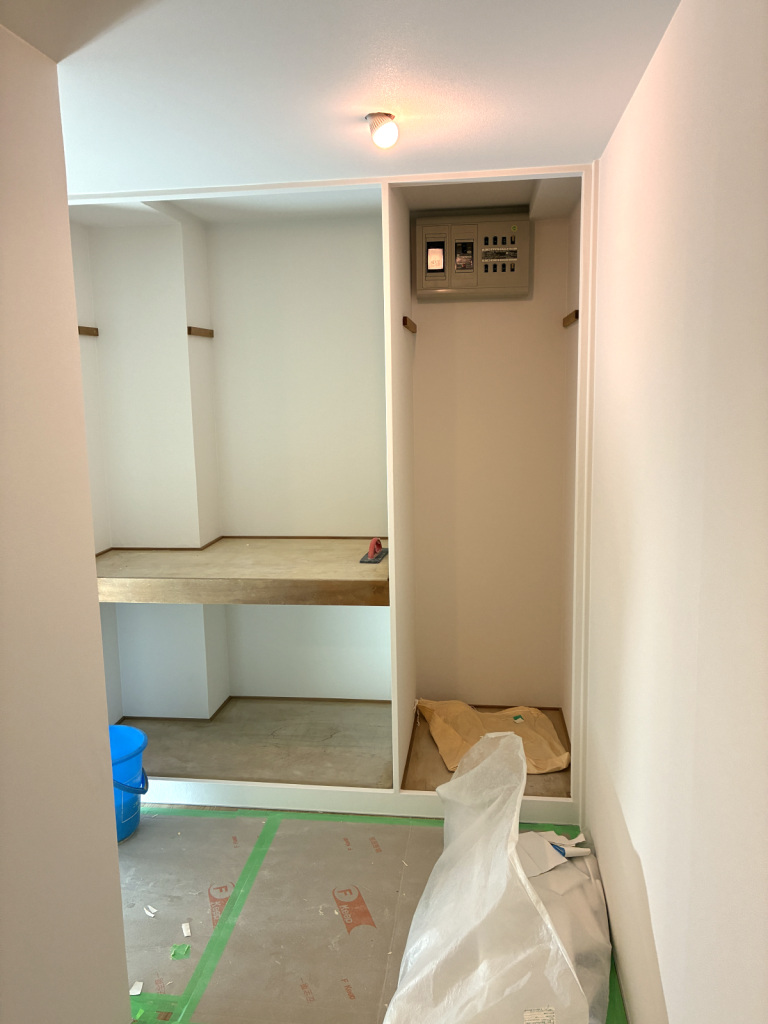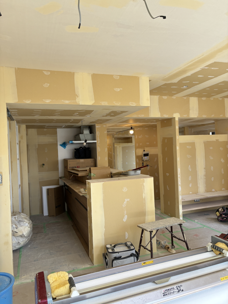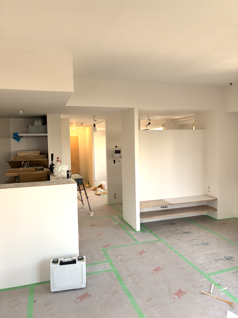 マンションリノベ⑤ クロス工事 2025.10.23 (木) リフォーム ツイート いよいよ仕上工事 クロスのパテ作業からスタートです ビス穴や石膏ボードのジョイント部分にパテを塗り 乾燥してから削って平滑にします クロスが貼りあがったことで キッチンの下がり壁と腰壁の一体感 右手に見えているテレビボードも 上部が抜けていることで奥行きが生まれました 壁と天井が白くなることで、下地の状態よりも広く見えますね 廊下部分もクロスが仕上がりました あとは仕上の建具や照明機器 美装などを行なっていきます!