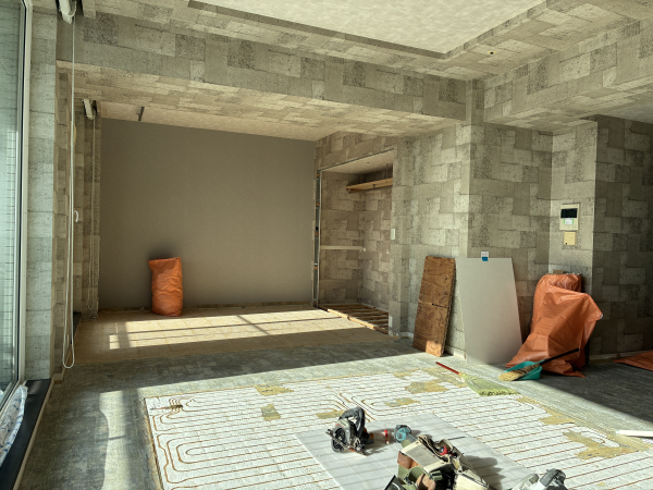 床のコンクリートスラブに張り巡らされた、床暖房のパイピング