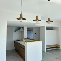 クロス工事も終わり 照明器具が付きました 金古美色のシェードが可愛いペンダントライト ここにはダイニングテーブルを設置しますので 後からペンダントライトの高さを調整します キッチンカウンターはじめ、集成材の箇所は オイル塗装で仕上げます 幅広で見付を薄く見せた天板、カッコいいです◎ 今度薄さがよく分かるデ…